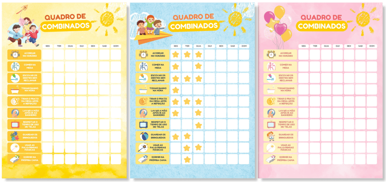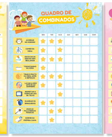 Quadro com 10 rotinas, como acordar no horário, comer sentado à mesa ou guardar os brinquedos. A cada tarefa feita, uma estrelinha! Adquirindo, você receberá as 3 cores (azul, amarelo e rosa), escolha a sua e imprima!